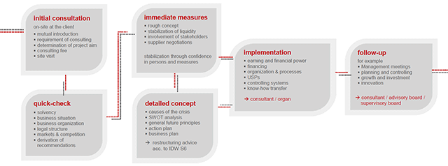 Often a corporate crisis is only recognized as such when the business already has reached the stage of an earnings crisis (a slump in profits or a loss) or a cash crisis. Both of those stages are usually preceded by a stakeholder, strategy and product crisis. Therefore, company reorganization must focus on both operational and strategic realignment. In the field of corporate reorganization san consult GmbH is specialized not only in taking initial measures (usually to maintain a company’s ability to meet its payment obligations or to prevent its insolvency), but also to assume operational and strategic steps. At the same time an advice on the continuation of the company according to principles promulgated by the Institute of Public Auditors in Germany (IDW S 6) will be issued, which is also the reorganization guideline for all stakeholders.